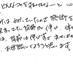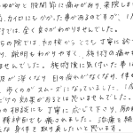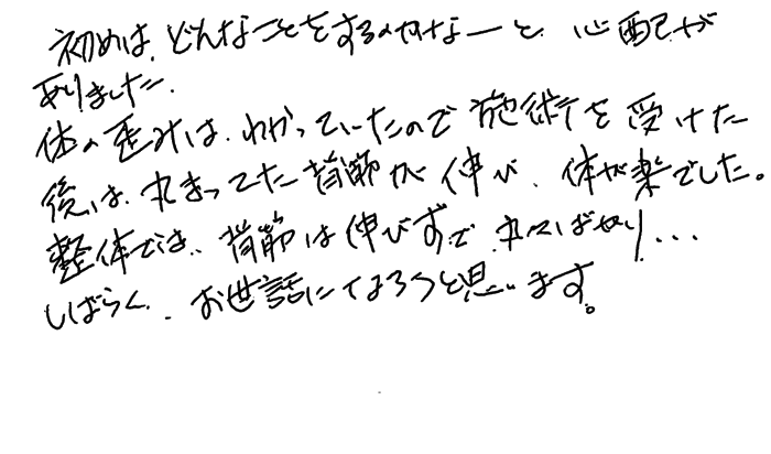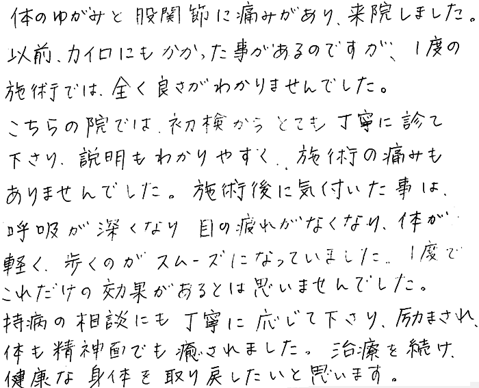 治療は痛みは全くありません。でも施術が進むにつれ、体がすっきりしていくのが分かりました。続けていき、ゆがみを治して健康な身体にしたいと思っています。