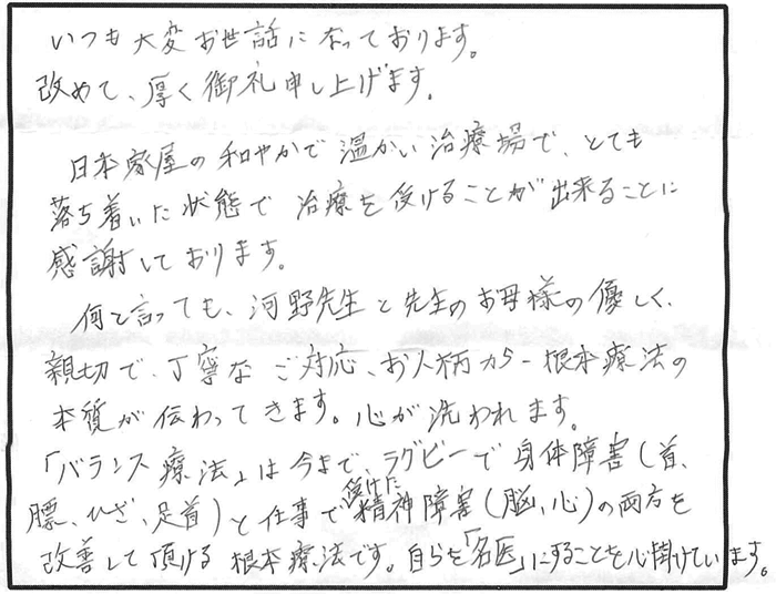 何と言っても親切で、河野先生と先生のお母様の優しく、丁寧なご対応、お人柄から根本治療の本質が伝わってきます。心が洗われます。