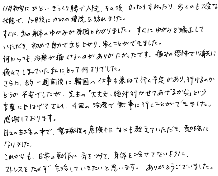 さらに約1週間後に韓国へ仕事もかねて行く予定があり、いけるのかどうか不安でしたが、先生の「大丈夫、絶対行かしてあげるから」という言葉にはげまされ、4回の治療で無事行くことができました。感謝しております。