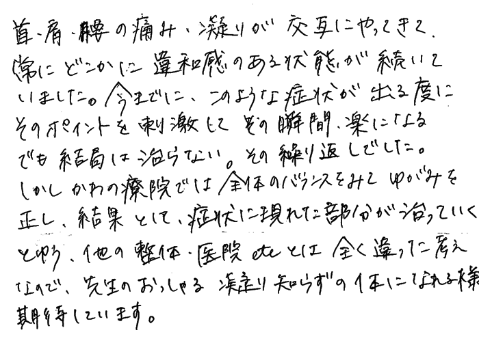 首・肩・腰の痛み・凝りが交互にやってきて、常にどこかに違和感のある状態が続いていました。