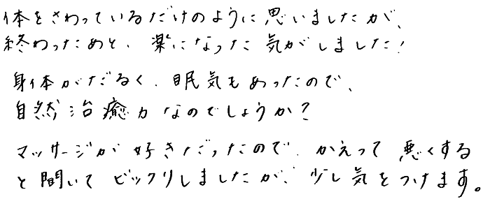 体をさわっているだけのように思えましたが、終わったあと、楽になった気がしました!
