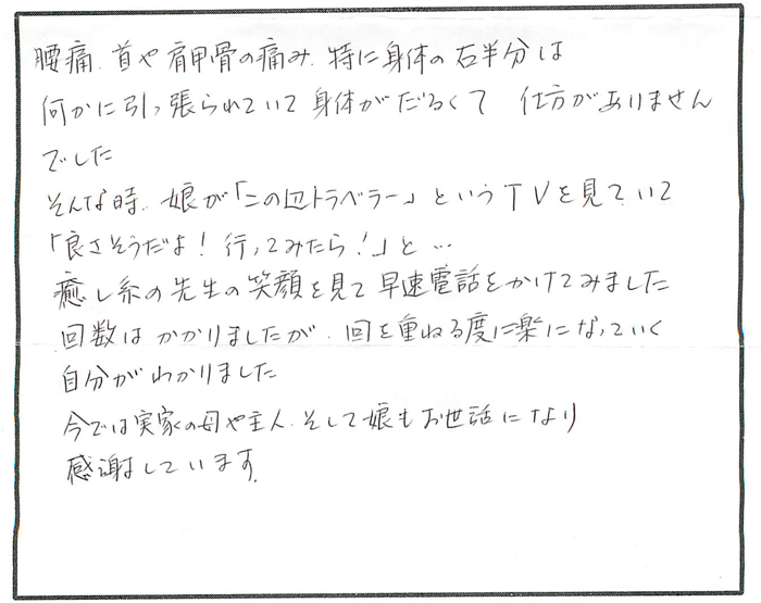 特に昔から首の痛みには悩まされてきたので、そこに着目し、治して下さったことが嬉しく、またとても助かっています。