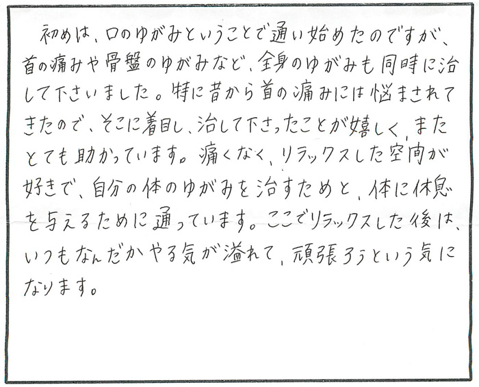 初めは、口のゆがみということで通い始めたのですが、首の痛みや骨盤のゆがみなど、全身のゆがみも同時に治して下さいました。