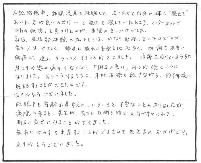 妊娠中も高齢出産ゆえに、いろいろと不安なこともありましたが、療院に来ると、先生が、明るい口調と話で元気づけてくれて、明るい気分になることができました。