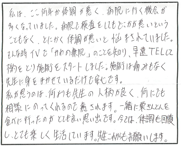 私は、ここ何年か体調が悪く、病院に行く機会が多くなっていました。病院で検査をしてもどこかが悪いということもなく、とにかく体調が悪いと悩まされていました。
