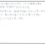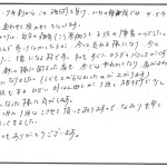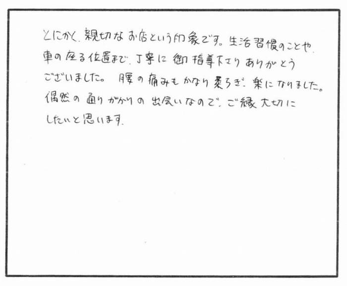 - 施術だけでなく日常の体のケアも教えていただき、歩き方、座り方を気をつけるようにしているのも良かったと思う。