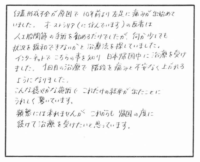 インターネットでこちらの事を知り、日本帰国中に治療を受けました。1回目の治療で階段を痛みと不安なく上がれるようになりました。
