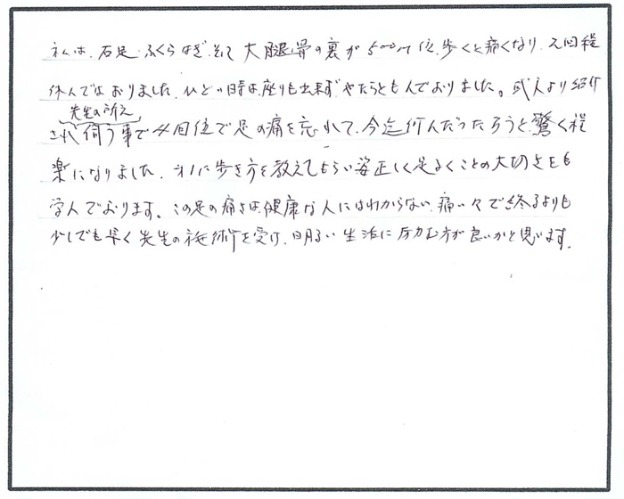 知人より紹介され先生の所へ伺う事で4回位で足の痛みを忘れて、今迄何だったろうと驚く程楽になりました。