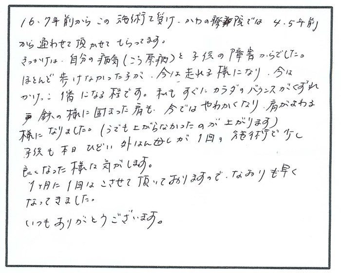 16,7年前からこの施術を受け、かわの療院では4,5年前から通わせて頂かせてもらってます。