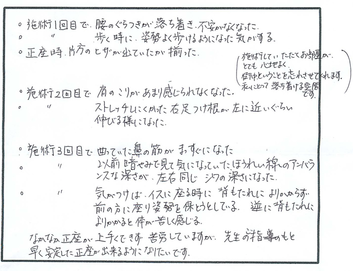正座することもできなかったが、15分位の正座はできるようになった。 - 立ったり座ったりが痛くて苦痛であったが、ずい分楽になった。