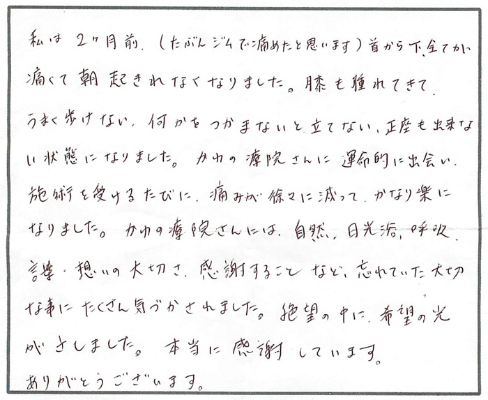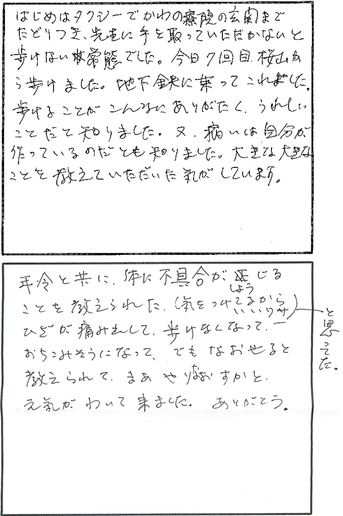 はじめはタクシーでかわの療院の玄関までたどりつき、先生に手を取っていただかないと歩けない状態でした。今日7回目、桜山から歩けました。地下鉄に乗ってこれました。歩けることがこんなにありがたく、うれしいことだと知りました。又、痛いは自分が作っているのだとも知りました。大きな大きなことを教えていただいた気がしています。