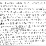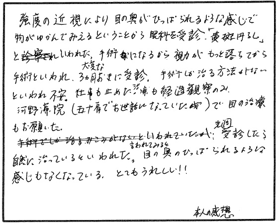 強度の近視により目の奥がひっぱられるような感じで物がゆがんで見えるということから、眼科を受診。「黄斑円孔」といわれた。大変な手術になるから 視力がもっと落ちてから手術といわれ、3カ月おきに受診。手術しか治る方法がないといわれ不安。仕事も止めた。治療も経過観察のみ。かわの寮院(五十肩で お世話になっていた)で目の治療もお願いした。