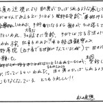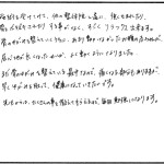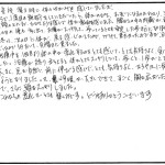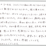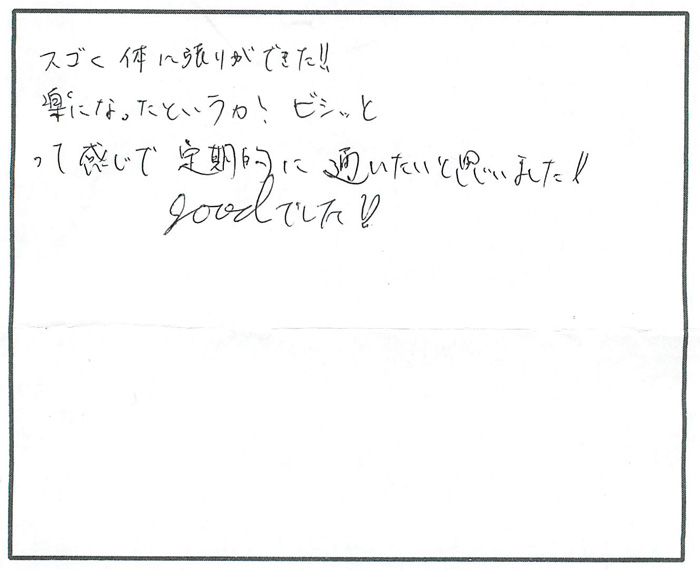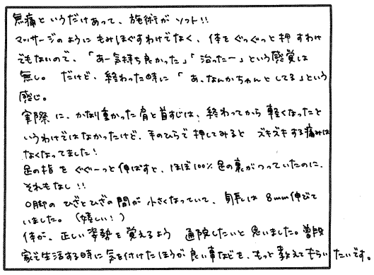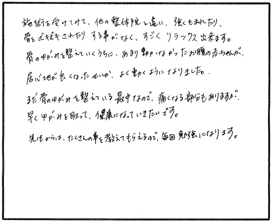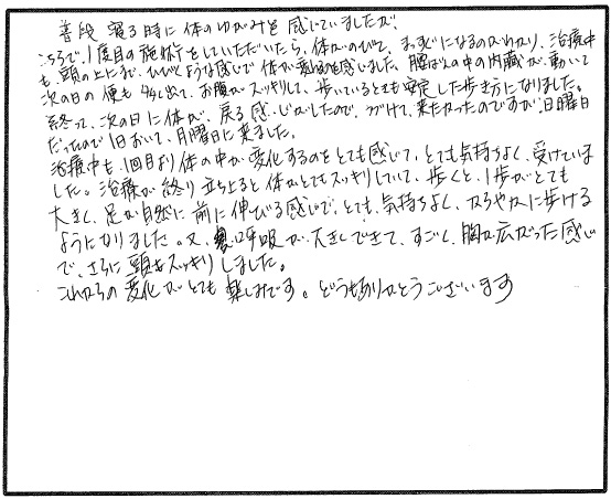 普段寝る時に、体のゆがみを感じていましたが、こちらで1度目の施術をしていただいたら、体が伸びてまっすぐになるのが分かり、治療中も頭の上にまでひびくような感じで体が変わるのを感じました。腰ばんの中の内臓が動いて次の日の便も多く出て、お腹がスッキリして歩いているときも安定した歩き方になりました。