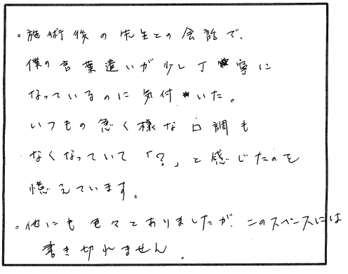 最初に来られた時のお顔とよくなったお顔とは全然違って喜びに満ちた様子に感動しました。