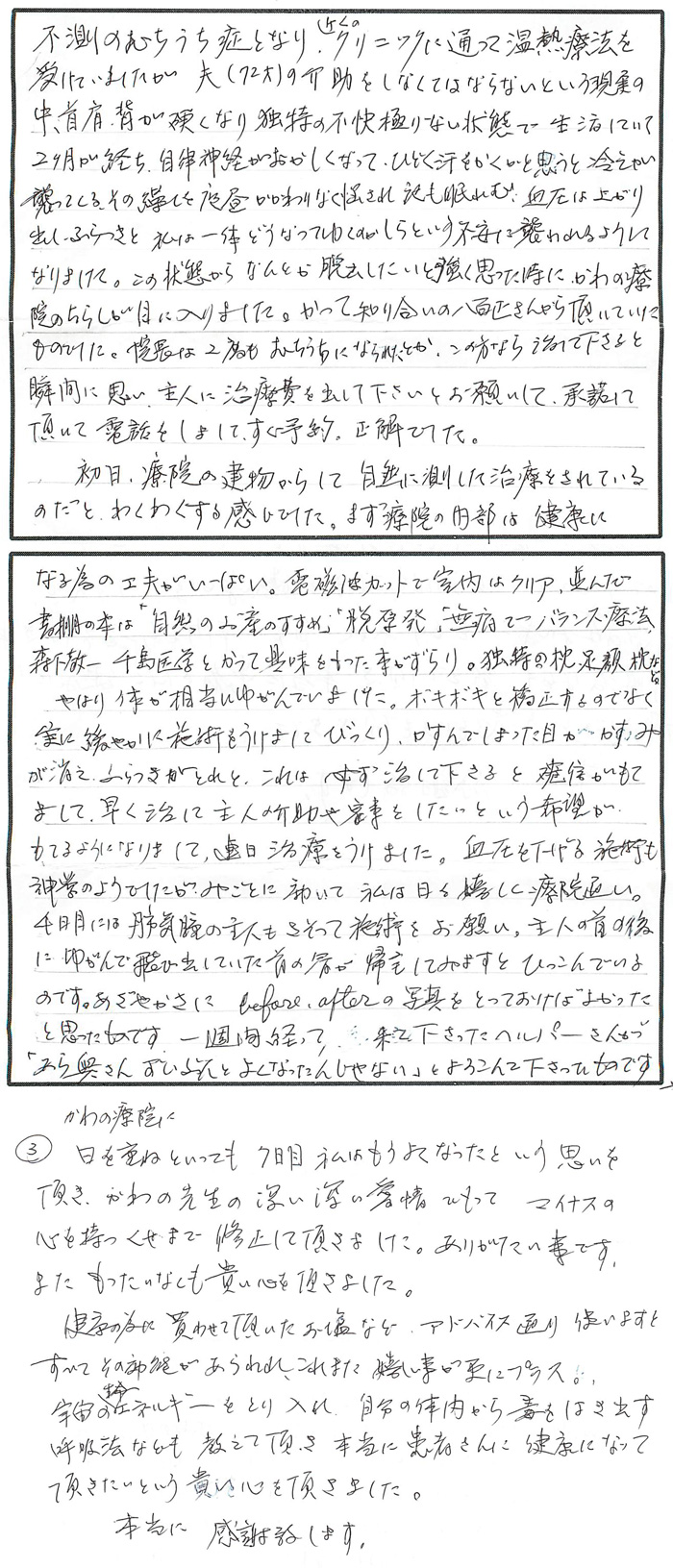 不測のむちうち症となり、近くのクリニックに通って温熱療法を受けていましたが、夫(72才)の介助をしなくてはならないという現実の中、首・肩・背が硬くなり独特の不快極まりない状態で生活していて24月が経ち、自律神経がおかしくなって、ひどく汗をかくかと思うと冷えが襲ってくる、その繰り返しを夜昼かかわりなく悩まされ夜も眠れず、血圧は上がり出しふらつきと私は一体どうなってゆくのかしらという不安に襲われるようになりました。この状態からなんとか脱出したいと強く思った時に、かわの療院のちらしが目に入りました。かつて知り合いの八百正さんから頂いていたものでした。院長は2度もむちうちになられたとか。この方なら治して下さると瞬間に思い、主人に治療費を出して下さいとお願いして、承諾して頂いて電話をしまして、すぐ予約。正解でした。