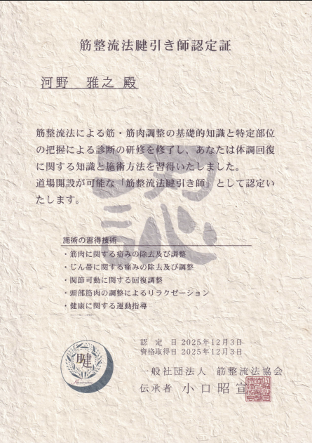 そしてついに、2025年10月13日から12月3日まで、51日間に及ぶ筋整流法・腱引き療法 小口昭宣先生直伝最後の集中講座を卒業することができました。 筋整流法腱引き師として認定いただき、ギックリ腰、捻挫、五十肩などに対して余裕で対応できるようになりました! 日本古来からの「和」を大切にする大和整体は、無痛バランス療法から始まり、ちょっと有痛バランス療法(腱引き療法)を加えることにより、完全になりました。 ありがとうございました‼️